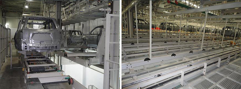 主要用來完成將焊裝調整線輸送過來的車身輸送到涂裝車間;將焊裝過來的車身進行儲存,以保證涂裝車間與焊裝車間產量不一樣而影響涂裝的產能;按車型不同進行車型的分類儲存,涂裝車間可以根據銷售情況進行不同車型的生產。