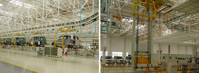 該系統(tǒng)主要由以下三部分組成:漆后車(chē)身輸送線(xiàn)、內(nèi)裝飾線(xiàn)、底盤(pán)線(xiàn)。漆后車(chē)身輸送線(xiàn)主要用于將涂裝好的車(chē)身儲(chǔ)存及轉(zhuǎn)運(yùn),線(xiàn)體采用滑撬輸送機(jī),涂裝車(chē)間的旋轉(zhuǎn)滾床將編組后的漆后車(chē)身送入過(guò)廊上的雙鏈輸送機(jī)。車(chē)身在過(guò)廊上儲(chǔ)存和輸送,在轉(zhuǎn)掛滾床上定位,經(jīng)液壓舉升叉式移栽機(jī)將車(chē)身轉(zhuǎn)移到旋轉(zhuǎn)滾床上,在通過(guò)叉式移栽升降機(jī)將車(chē)身落到內(nèi)裝飾線(xiàn)的隨動(dòng)裝置上。內(nèi)裝飾線(xiàn)采用版式輸送機(jī),從漆后車(chē)身輸送線(xiàn)通過(guò)隨動(dòng)裝置接漆后車(chē)身,再將內(nèi)飾后的車(chē)身送到底盤(pán)線(xiàn)。底盤(pán)線(xiàn)包括:底盤(pán)裝配線(xiàn)、車(chē)門(mén)分裝線(xiàn)、車(chē)輪分裝線(xiàn)、儀表臺(tái)分裝線(xiàn)、前懸分裝線(xiàn)、后懸分裝線(xiàn)、發(fā)動(dòng)機(jī)分裝線(xiàn)、座椅分裝線(xiàn)、最終裝配線(xiàn)等。控制系統(tǒng)采用五套分控制系統(tǒng),系統(tǒng)一控制漆后車(chē)身輸送線(xiàn)及內(nèi)實(shí)現(xiàn)轉(zhuǎn)接升降設(shè)備;系統(tǒng)二控制內(nèi)飾車(chē)門(mén)線(xiàn)及儀表分裝線(xiàn);系統(tǒng)三控制底盤(pán)、輪胎、座椅線(xiàn)、發(fā)動(dòng)機(jī)和前后懸分裝線(xiàn);系統(tǒng)四控制最終裝配線(xiàn)、車(chē)身轉(zhuǎn)運(yùn)及OK線(xiàn);系統(tǒng)五控制外觀檢測(cè)線(xiàn)。