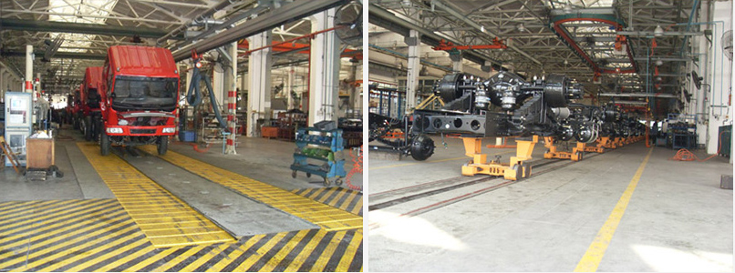 一線副線垂直地拖鏈采用標準板式牽引鏈帶臺板的結構方式,主要由驅動裝置、傳動軸總成、拉緊軸總成、中間支架、車架支撐小車、頭架總成、尾架總成等,相對于一線主線的控制部分獨立分開,不設聯鎖功能。該生產線共有14個工位,每個工位設工位三色顯示燈,左右兩側各設按鈕和一個,有急停、求援和缺件三個按鈕,按鈕盒沿線布置。系統設大屏幕顯示屏,用于車間內現場輸數據的實時同步顯示,顯示內容為“年計劃、月計劃、目前已生產累計產量等”顯示內容可存儲,產量自動累加,支持電腦后臺管理。一線副線的支撐臺車與先前的生產線互相通用,并逐一編號形成標記。