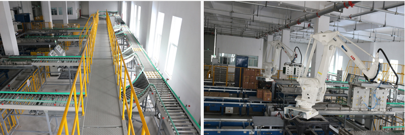 該項目由從各生產車間生產線末端(包括一樓四條生產線、二樓四條生產線),輸送成品箱至立體倉庫二樓機器人碼垛區域的紙箱輸送系統、機器人碼垛系統、庫前托盤出入庫輸送系統、貨架系統、堆垛機系統、托盤、WCS電氣控制系統、WMS管理系統、網絡通訊系統組成。