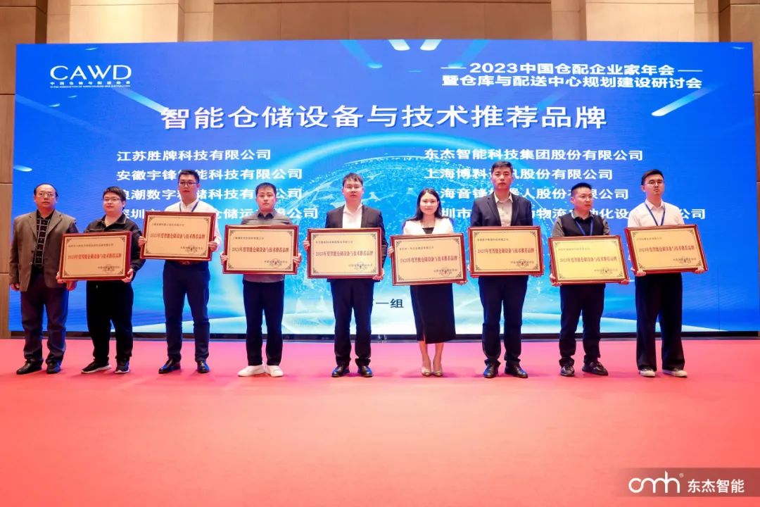 近日,2023 中國倉配企業家年會暨倉庫與配送中心規劃建設研討會在寧波順利召開,會上,東杰智能榮獲“2023年度智能倉儲設備與技術推薦品牌”榮譽。